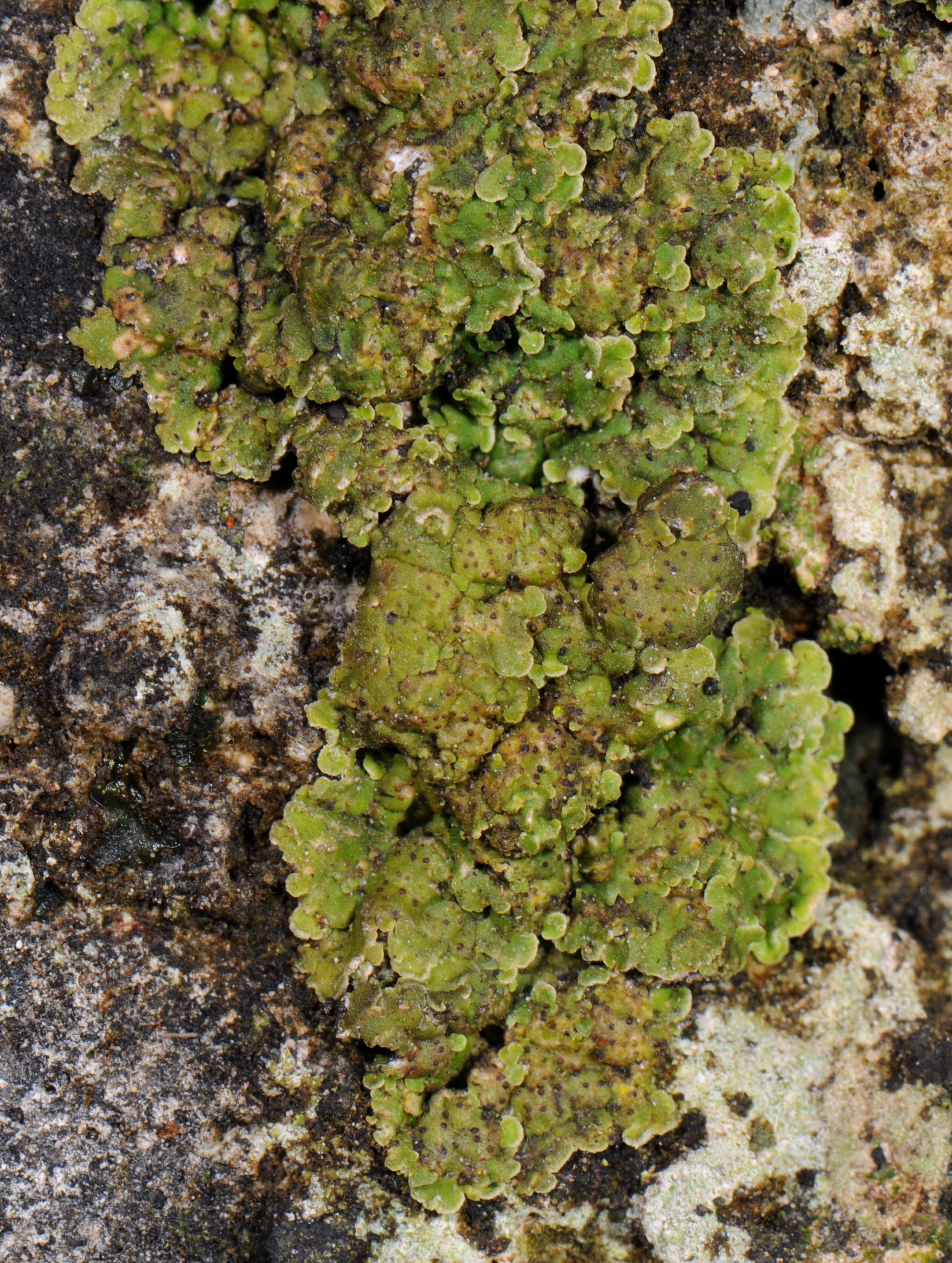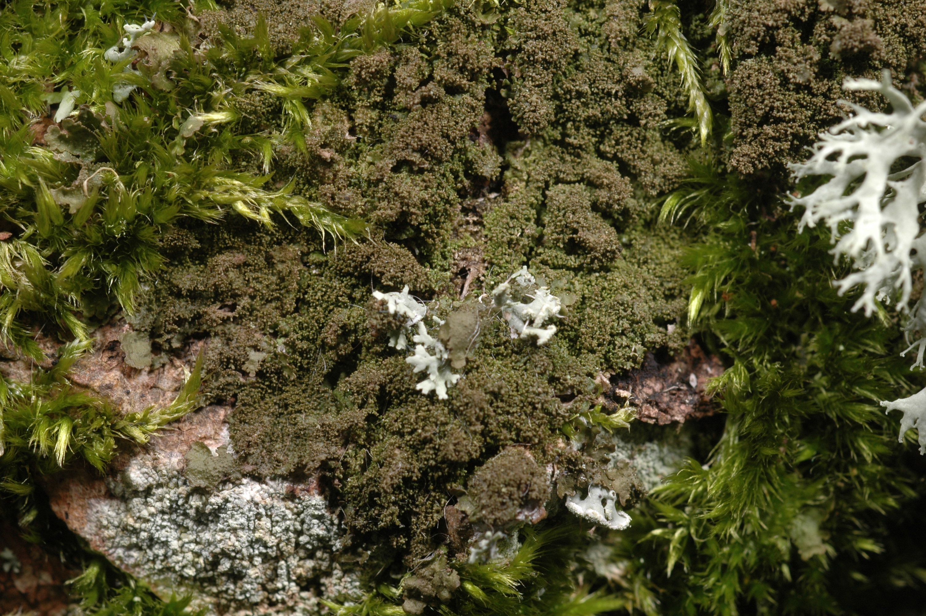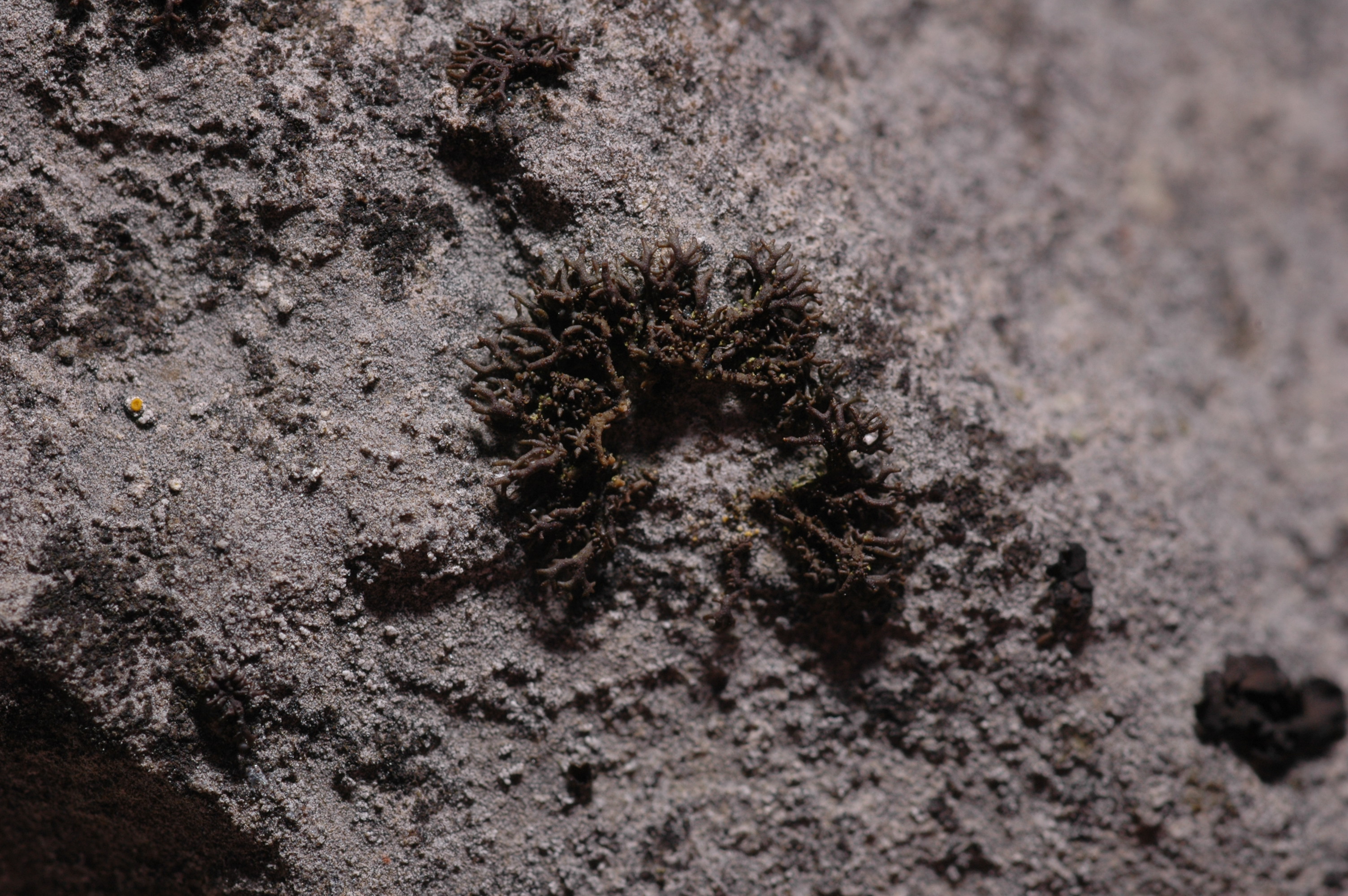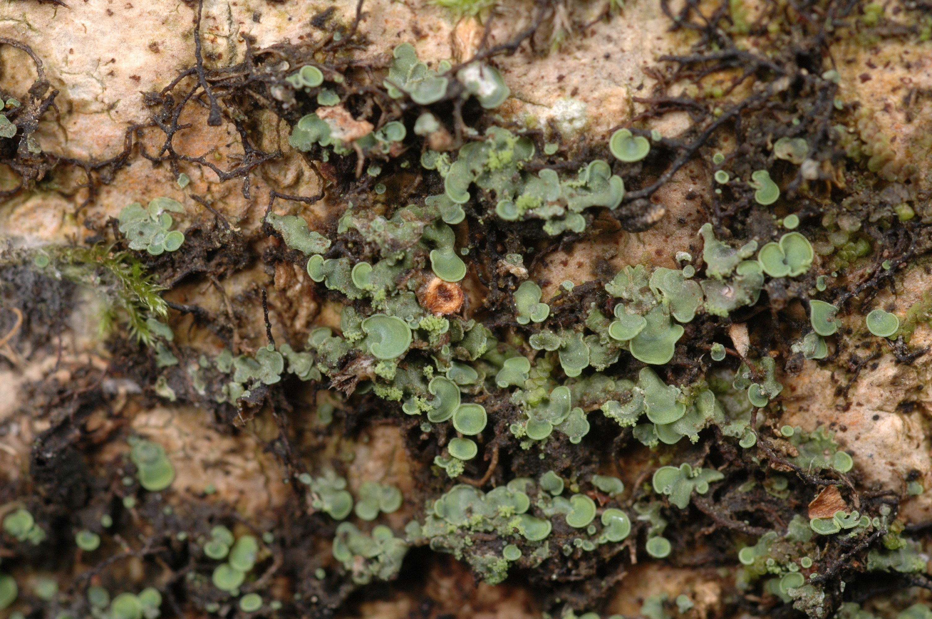 Vezdaea aestivalis (older specimen). M Sutcliffe. Overgrowing mosses on limestone wall. Malham moss tarn, West Yorkshire. small