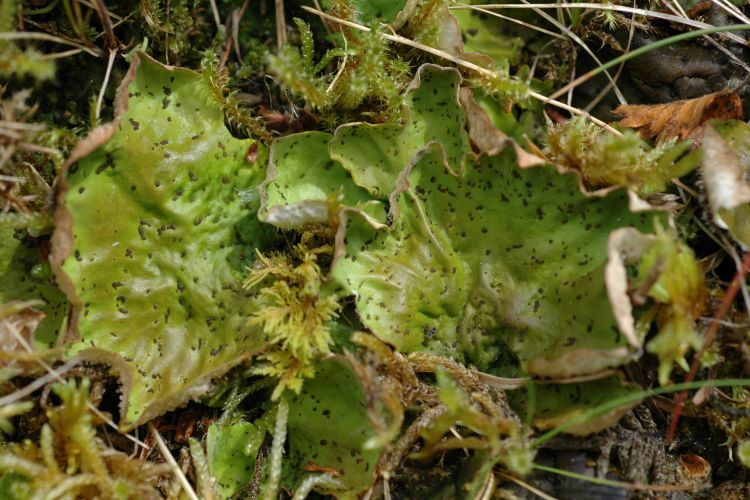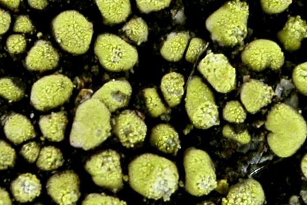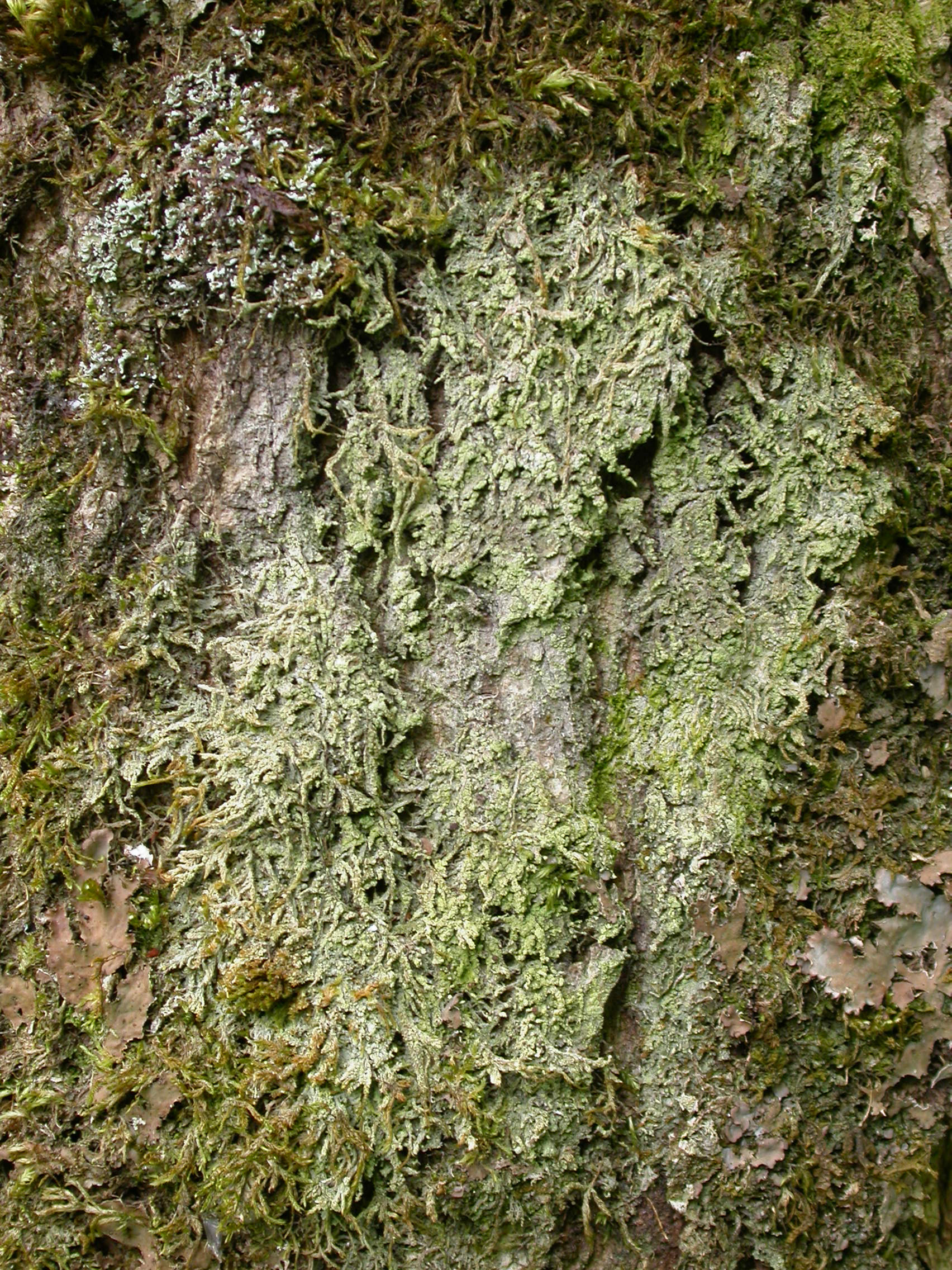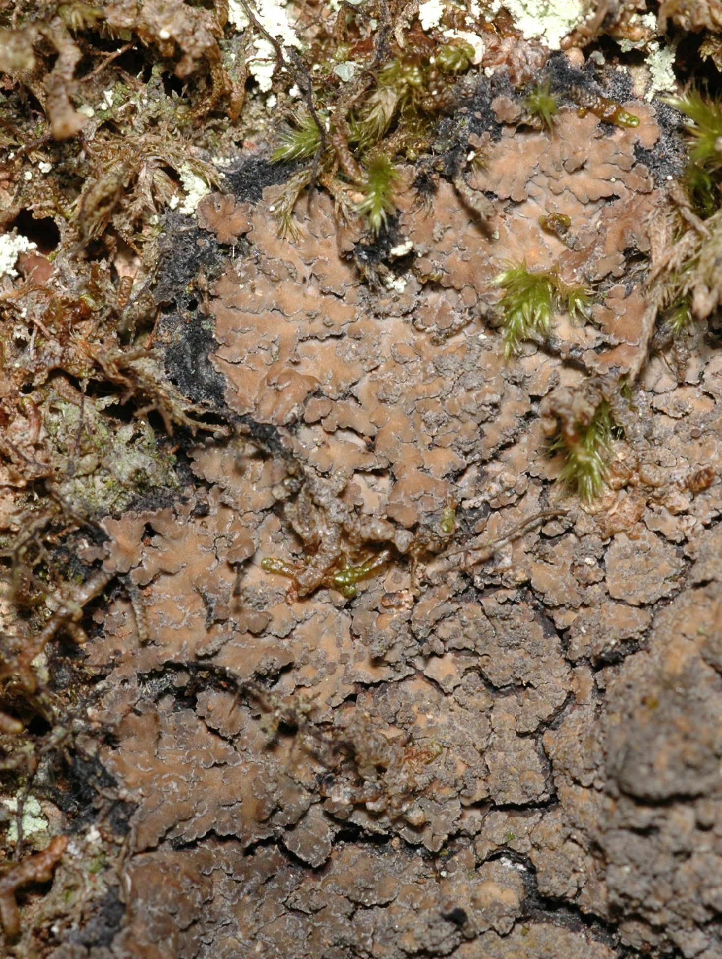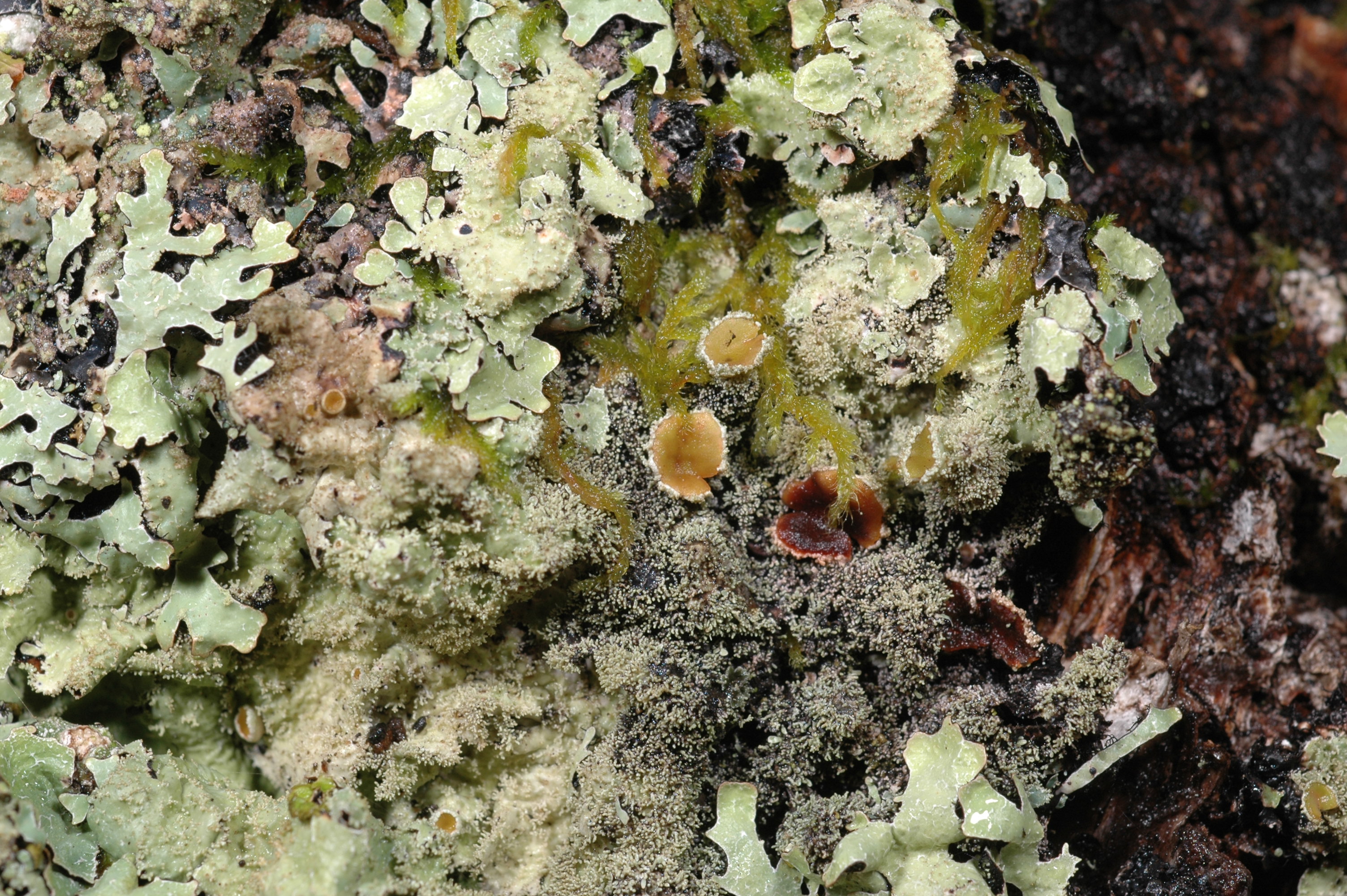 Vezdaea aestivalis (older specimen). M Sutcliffe. Overgrowing mosses on limestone wall. Malham moss tarn, West Yorkshire. small