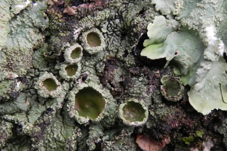 Umbilicaria deusta. Steve Price. With Parmotrema perlatum. Burbage Brook, Sheffield. small