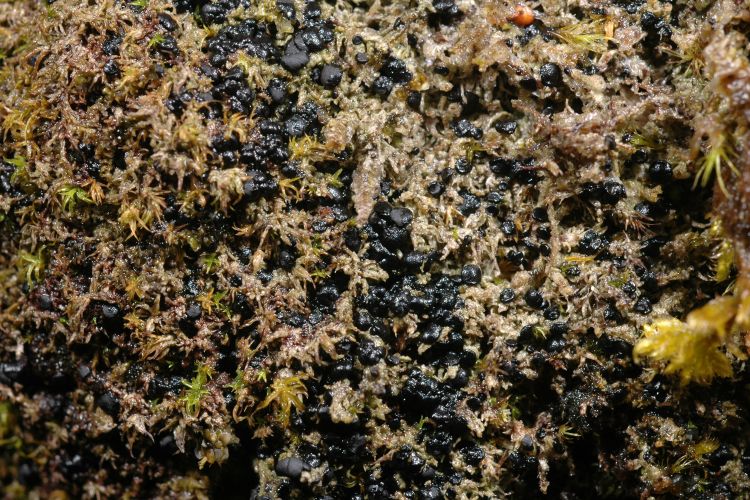 Anisomeridium polipori. M Sutcliffe. On bryophytes. Yew crags, Northumberland. small