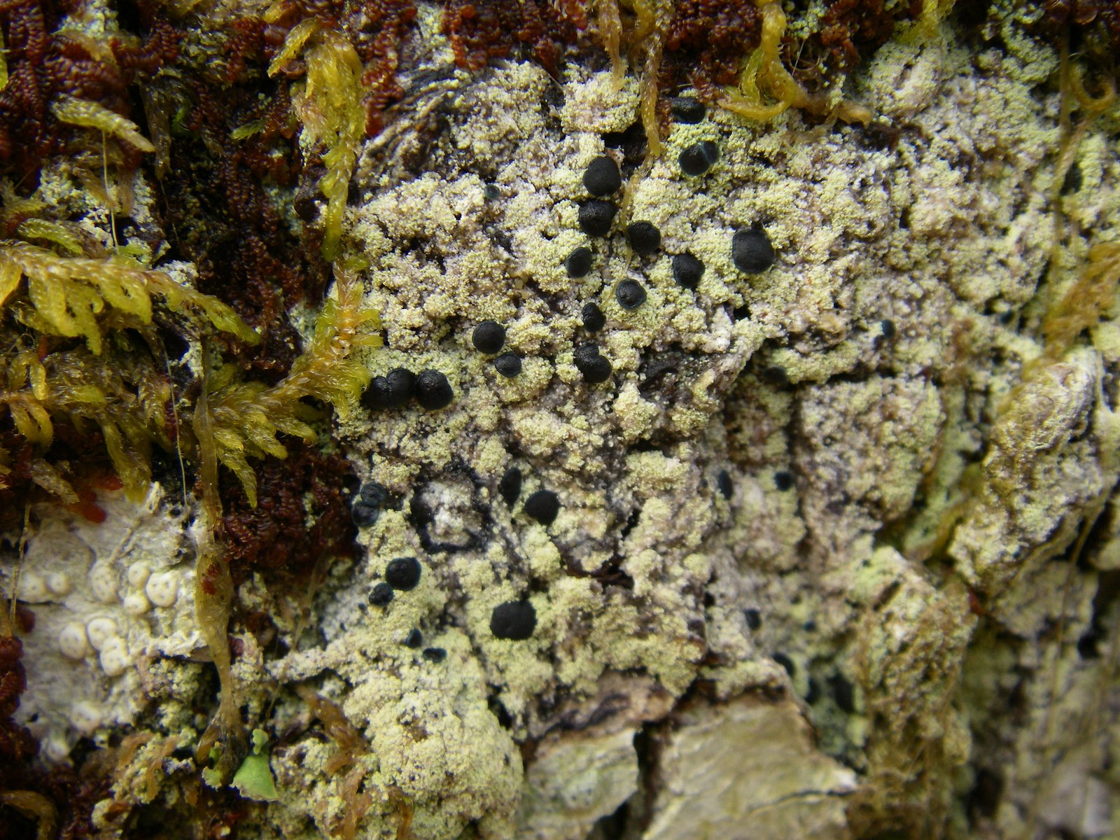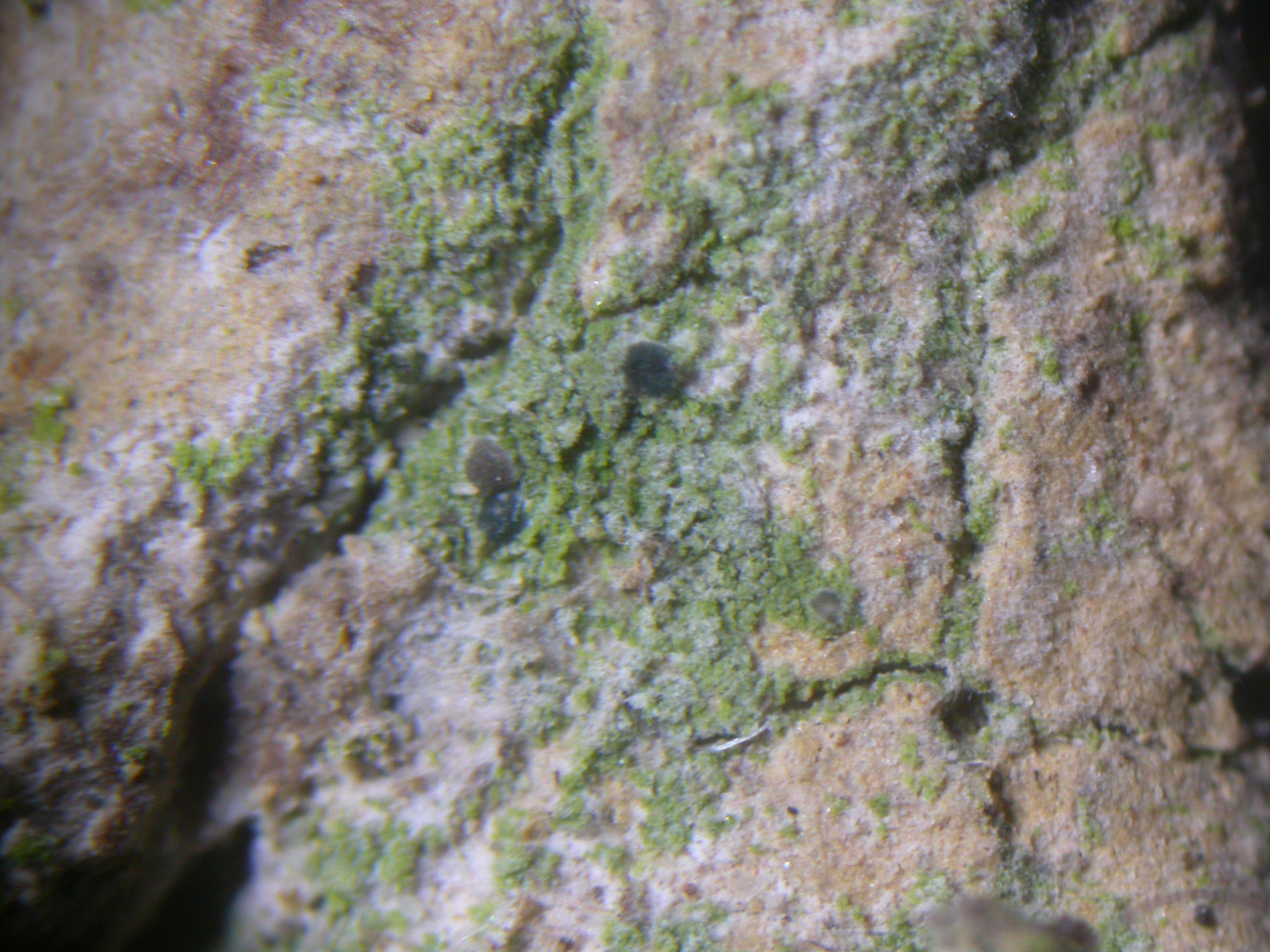 Arthopyrenia analepta. M Sutcliffe. On ash. Torridon Wood, Wester Ross, Scotland. With Trentepohlia algae growing on top. small
