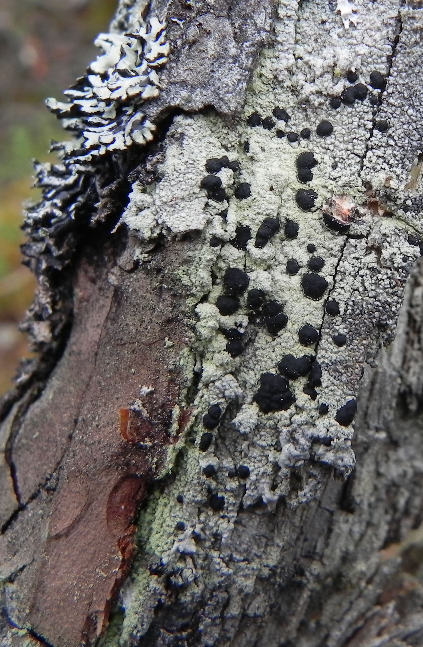Xerotrema megalospora. Neil Sanderson. On standing dead pine. Native pinewood, Allt nam Bo, Glen Feshie. small