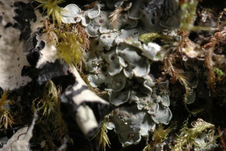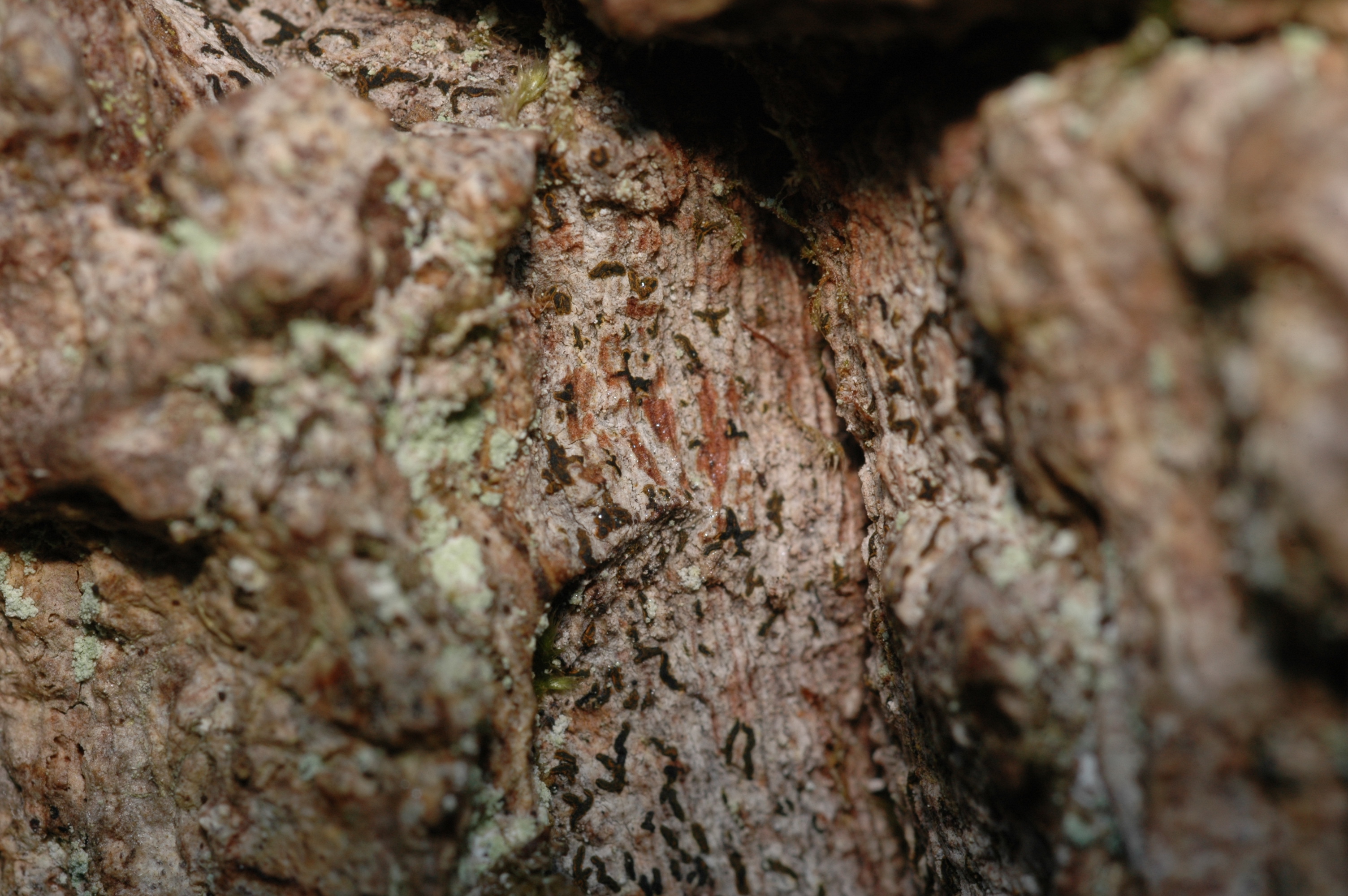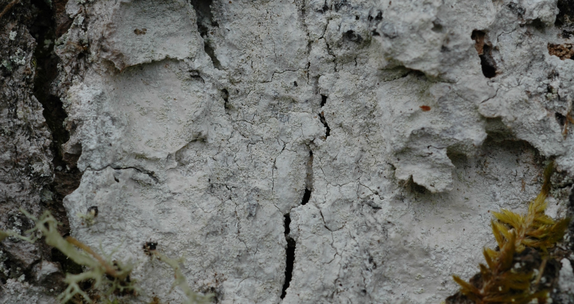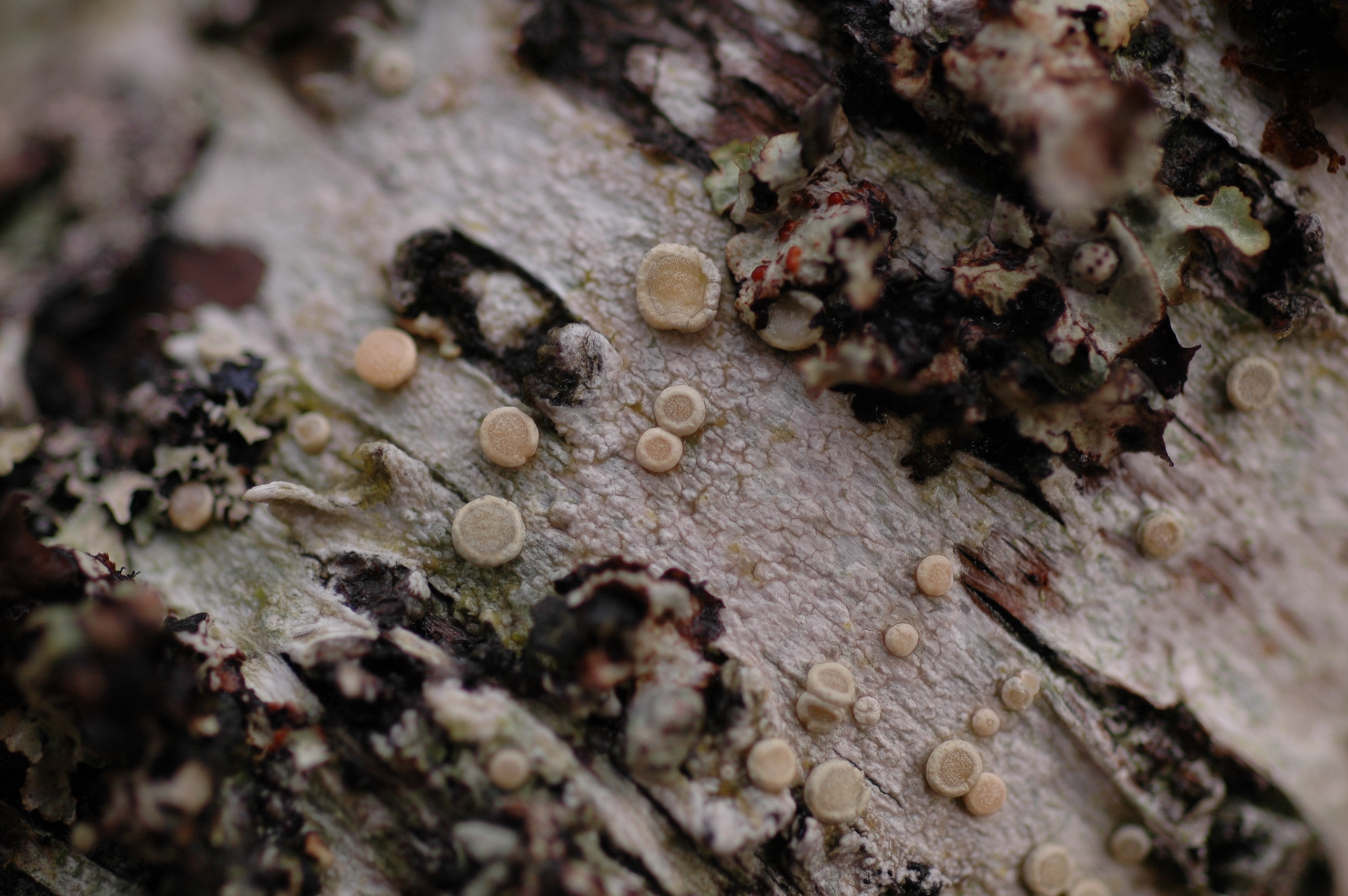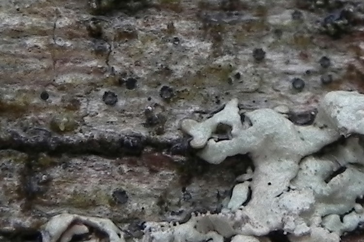 Xerotrema quercicola (with Imshaugia aleurites). Neil Sanderson. On vertical lignum on fallen dead oak. Denny Wood, New Forest. small