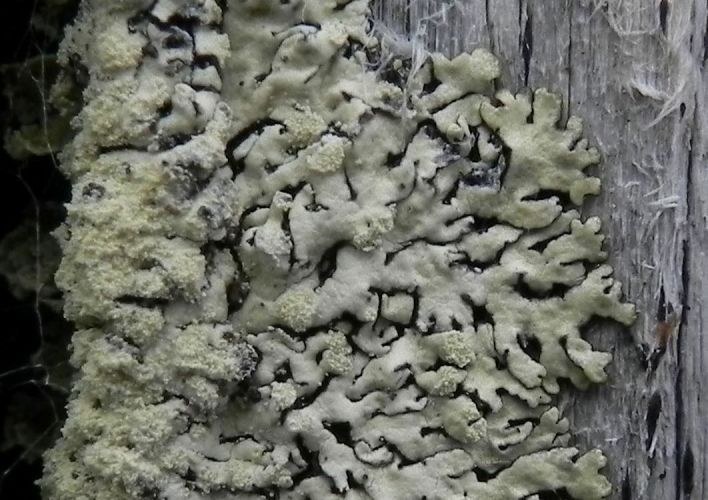 Xanthoparmelia mougeotii. M Sutcliffe. On pine garden seat. Brackenrigg, Keswick, Cumbria. small