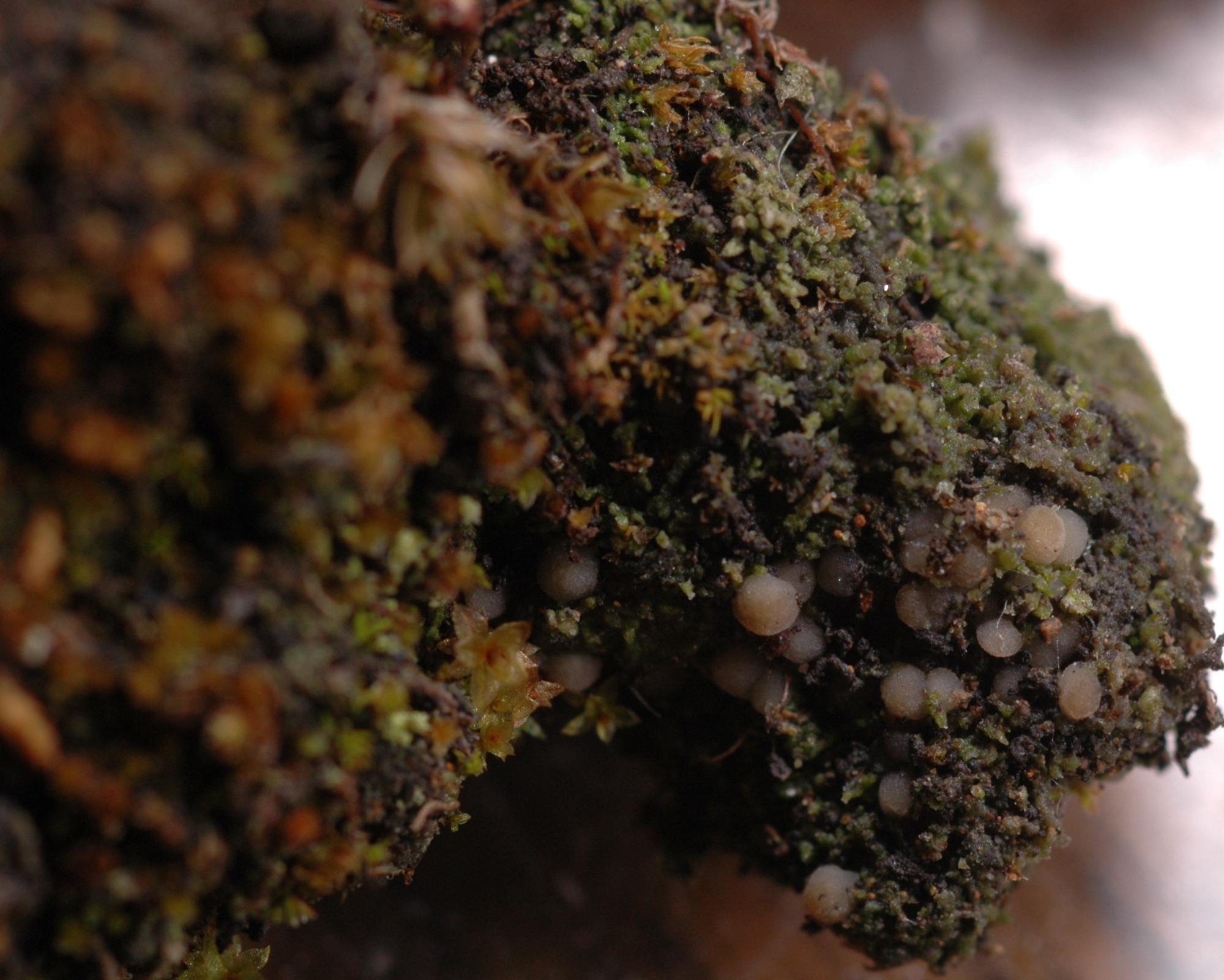 Agonimia globulifera. M Sutcliffe. On moss on limestone. Llanymynech Rocks, Shropshire. small